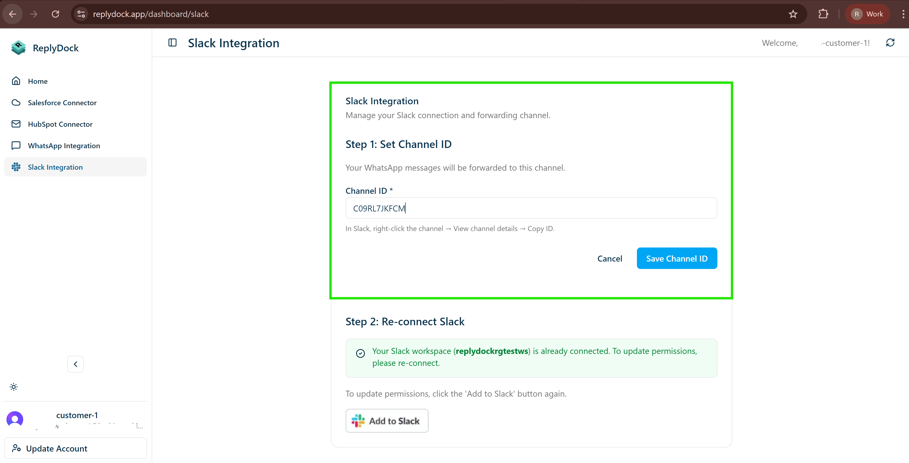 Step-by-step guide to connect your Slack workspace with ReplyDock for seamless WhatsApp-Slack messaging.
